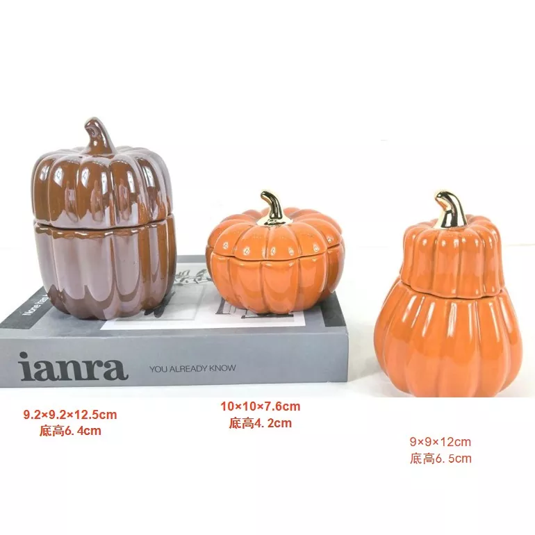 เครื่องประดับเซรามิกฟักทองฮัลโลวีน: ขวดมีการประดิษฐ์ขึ้นจริงและมีศิลปะเพื่อทำซ้ำสีธรรมชาติของฟักทอง ขวดมีสีน้ำตาลเข้มและสีส้มสดใสเลียนแบบสีธรรมชาติของฟักทองและมีฝาโลหะและลูกบิดโลหะสำหรับผิวที่สวยงามและสะดุดตา