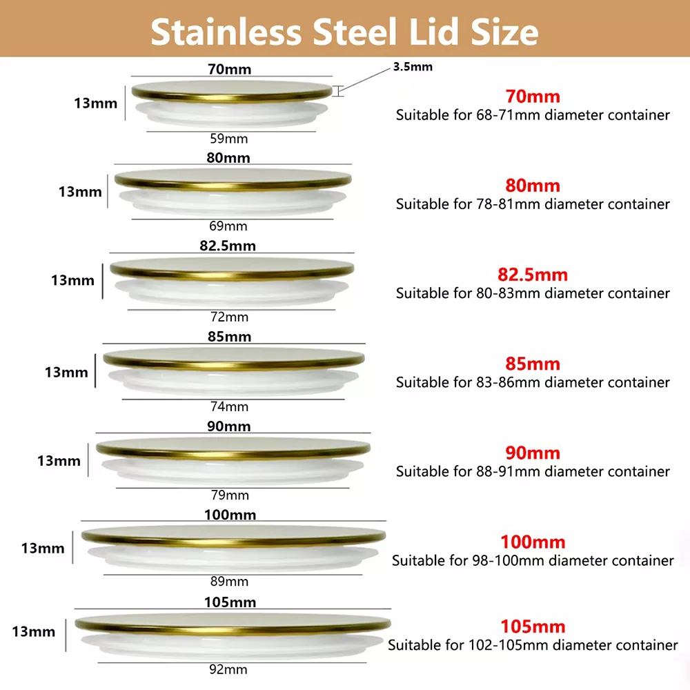การพิมพ์หน้าจอของเราฝาเทียนสแตนเลสสตีลมีให้เลือกหลายขนาดซึ่งมีความสูงโดยรวม 13 มม. มิติเฉพาะและช่องเปิดคอนเทนเนอร์ที่เข้ากันได้จะแสดงด้านล่าง: