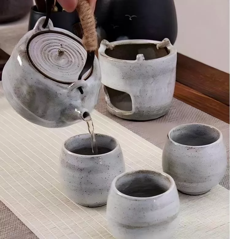 ชุดชาแบบดั้งเดิมนี้รวมถึงกาน้ำชาและถ้วยน้ำชาสามตัวและยังมีขาตั้งเซรามิกเพื่อให้หม้ออบอุ่น